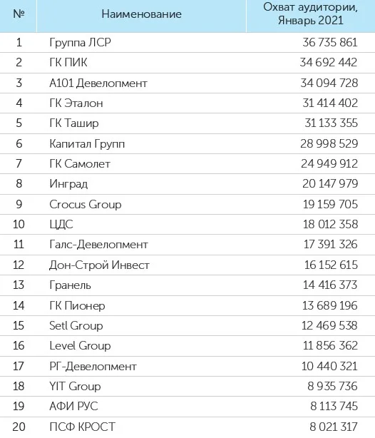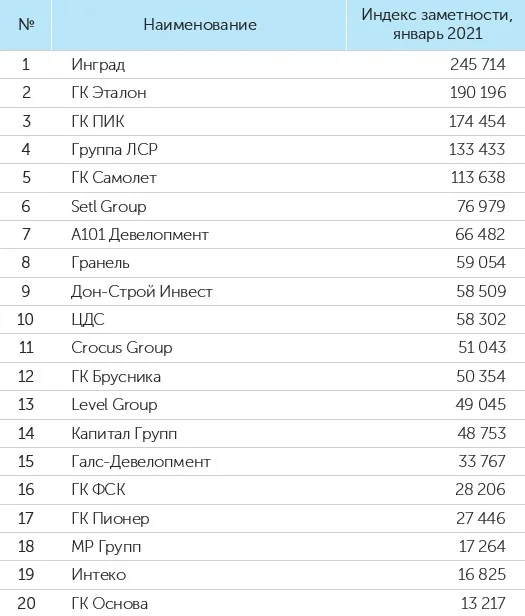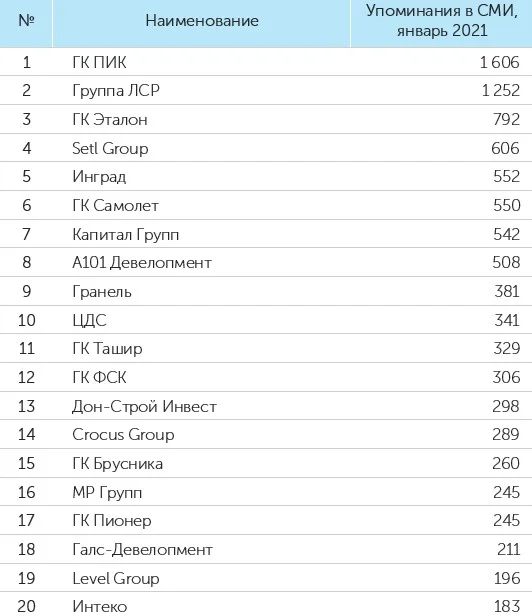 По итогам января 2021 года лидером рейтинга девелоперов по количеству упоминаний в СМИ заняла ГК «ПИК», при этом у компании второе место по охвату аудитории и третье — по медийной «заметности». На втором месте по количеству упоминаний и на первом – по охвату аудитории, расположилась Группа «ЛСР». Третьей самой упоминаемой компанией стала Группа «Эталон», занявшая помимо этого второе место в рейтинге «заметности». На первом месте по «заметности» компании в СМИ находится ГК «Инград». На третьей строчке рейтинга, оценивающего охват аудитории, расположилась ГК «А101». Об этом свидетельствуют данные составленного для «Стройгазеты» рейтинга «СКАН-Интерфакс».