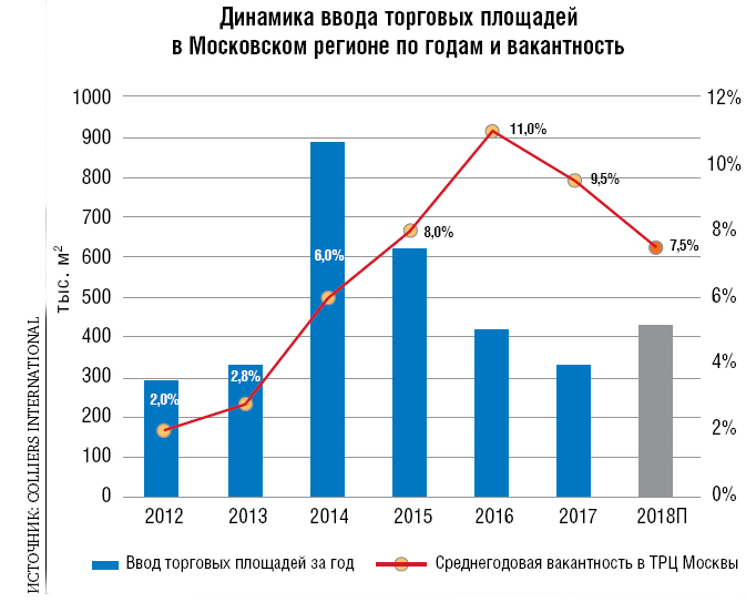 Начиная с 2013 года, уровень вакантности торговых площадей в ТЦ Москвы рос и достиг максимального значения в 11% в 2016 году. На протяжении 2017 года, по нашим расчетам, объем вакансии на рынке торговой недвижимости Москвы постепенно снижался и на конец года оценивается нами в 9,5%. В следующем году мы ожидаем дальнейшего снижения уровня вакантности.