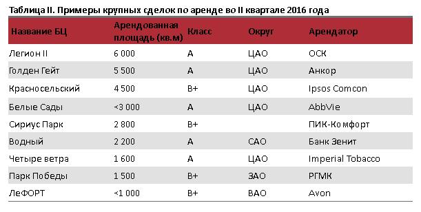 На конец II квартала 2016 года вакансия в классе А снизилась до 26,3% в классе В+ – до 16%, а в классах В и С, наоборот, возросла до 10,9% и 9,7% соответственно.
