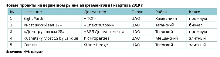 «В первом квартале 2019 года девелоперская активность на рынке апартаментов не была высокой, – комментирует Мария Литинецкая, управляющий партнер «Метриум» (участник партнерской сети CBRE). – Продажи открылись в пяти новых проектах, для сравнения – за аналогичный период в предыдущие годы на рынок выходило по 6-9 объектов. Примечательно, что все новые комплексы расположены в ЦАО и позиционируются в высокобюджетных сегментах (два – в элитном классе, два – в сегменте премиум и только один – в бизнес-классе).