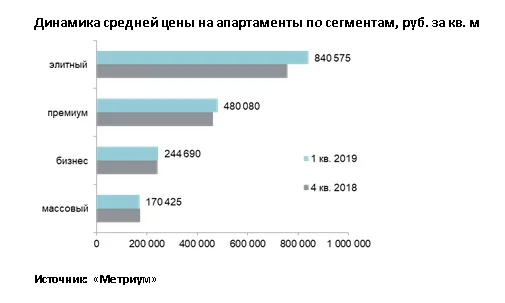 По подсчетам аналитиков, в первом квартале практически во всех классах зафиксировано повышение цены кв. метра. Исключением стал массовый сегмент, где за три месяца уровень средней стоимости сократился на 1,2% из-за структурных изменений и составил 170 425 рублей. В элитном классе средняя цена кв. метра достигла 840 575 рублей (+10,9%), в премиум-классе – 480 080 рублей (+4,1%). Средняя стоимость кв. метра в апартаментах бизнес-класса находилась на уровне 244 690 рублей (+0,9%). Основными факторами, повлиявшими на изменение ценового показателя, стали: повышение стоимости апартаментов по ряду проектов, выход нового объема по ценам выше среднерыночных, а также изменения структуры предложения.
