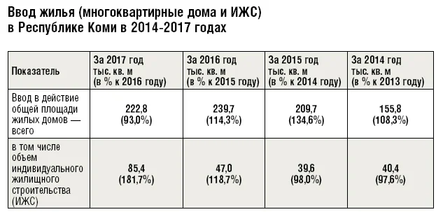 Позитивной тенденцией, развивающейся на республиканском рынке жилья, является постепенное снижение цены квадратного метра. Об этом свидетельствуют данные территориального органа Федеральной службы государственной статистики по Республике Коми (Комистат). В 2014 году цена «квадрата» общей площади жилья на первичном рынке составляла 60610 рублей. В последующие годы она стала снижаться и в 2015 году составила 55476 рублей, в 2016-м — 51380 рублей, а в прошлом году и вовсе 48279 рублей. По мнению республиканских властей, есть все основания полагать, что эта тенденция сохранится и в 2018 году. Менее заметно, но в том же направлении менялась и цена «квадрата» на вторичном рынке: 2014-й год — 59122 рубля, в 2017-м — 56498 рублей. На снижение стоимости квадратного метра жилья повлиял целый ряд факторов, но одним из главных было, конечно, увеличение объемов жилищного строительства (до 2017 года — МКД, в 2017-м — ИЖС).