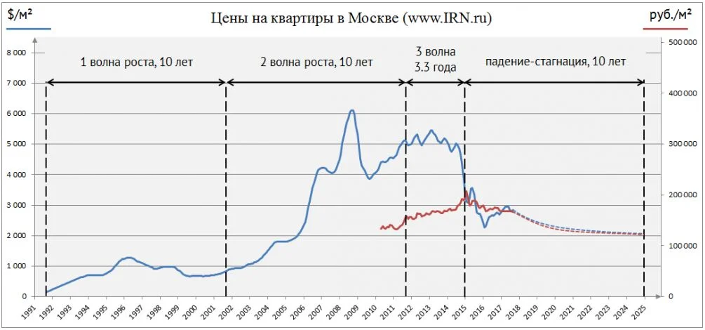 Этому есть объяснение. Сейчас не новый цикл-повторение предыдущих десятилетий, а конец более глобального супер-цикла становления рынка. Если в первой формуле каждый трехлетний цикл роста заменить на общий десятилетний цикл, то мы получаем следующую формулу: 10 лет роста + 10 лет роста + 3,3 года роста + 10 лет падения-стагнации = 33,3 года. Таким образом, сейчас мы находимся в финале этого супер-цикла, который завершится к 2024 году. Скорее всего, до 2020-2021 года цены еще будут сползать вниз, а затем произойдет их стабилизация. Каким будет рынок после 2024 года, пока говорить рано, но он точно будет другим: становление завершено, все болезни роста преодолены, должно случиться более спокойное развитие.