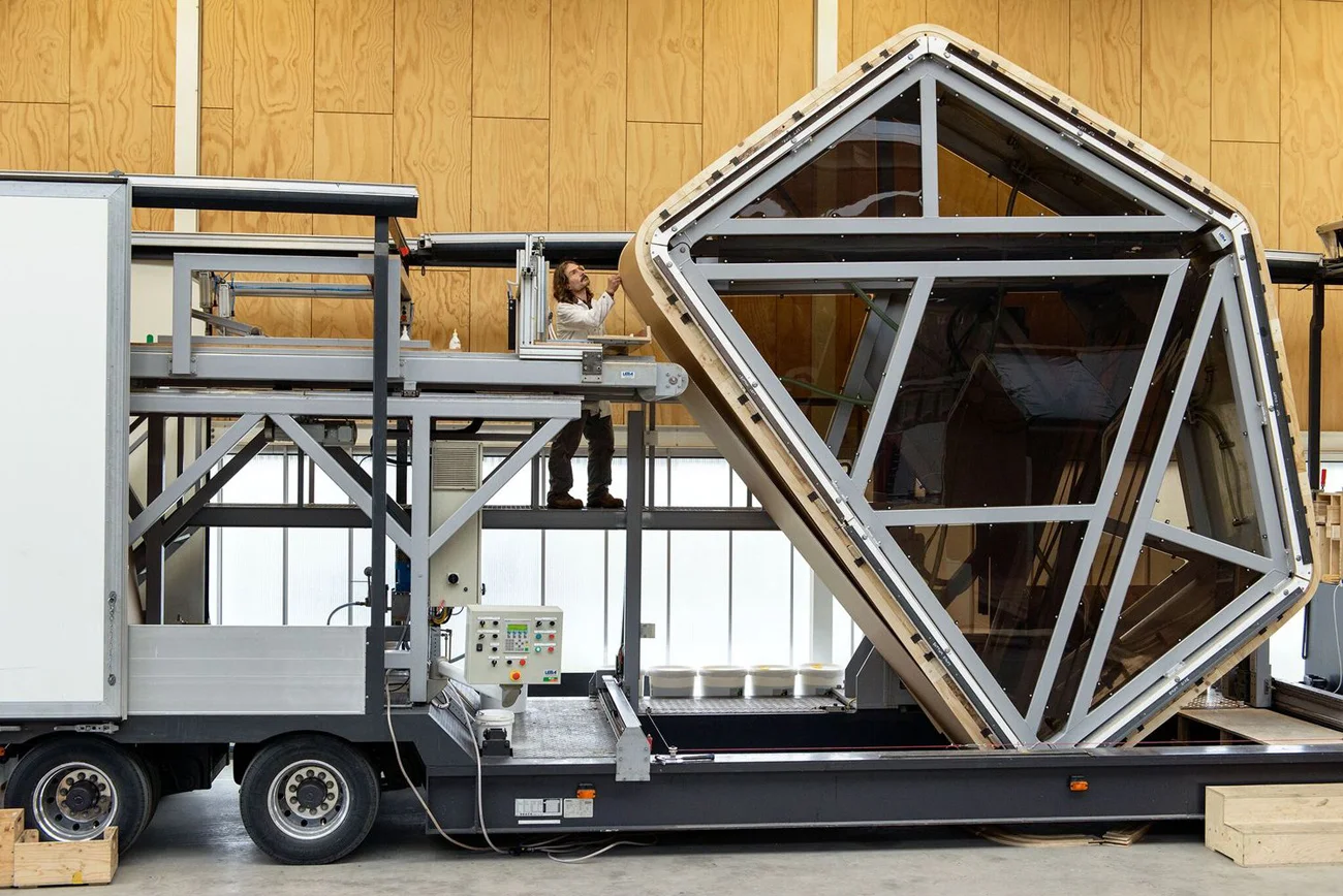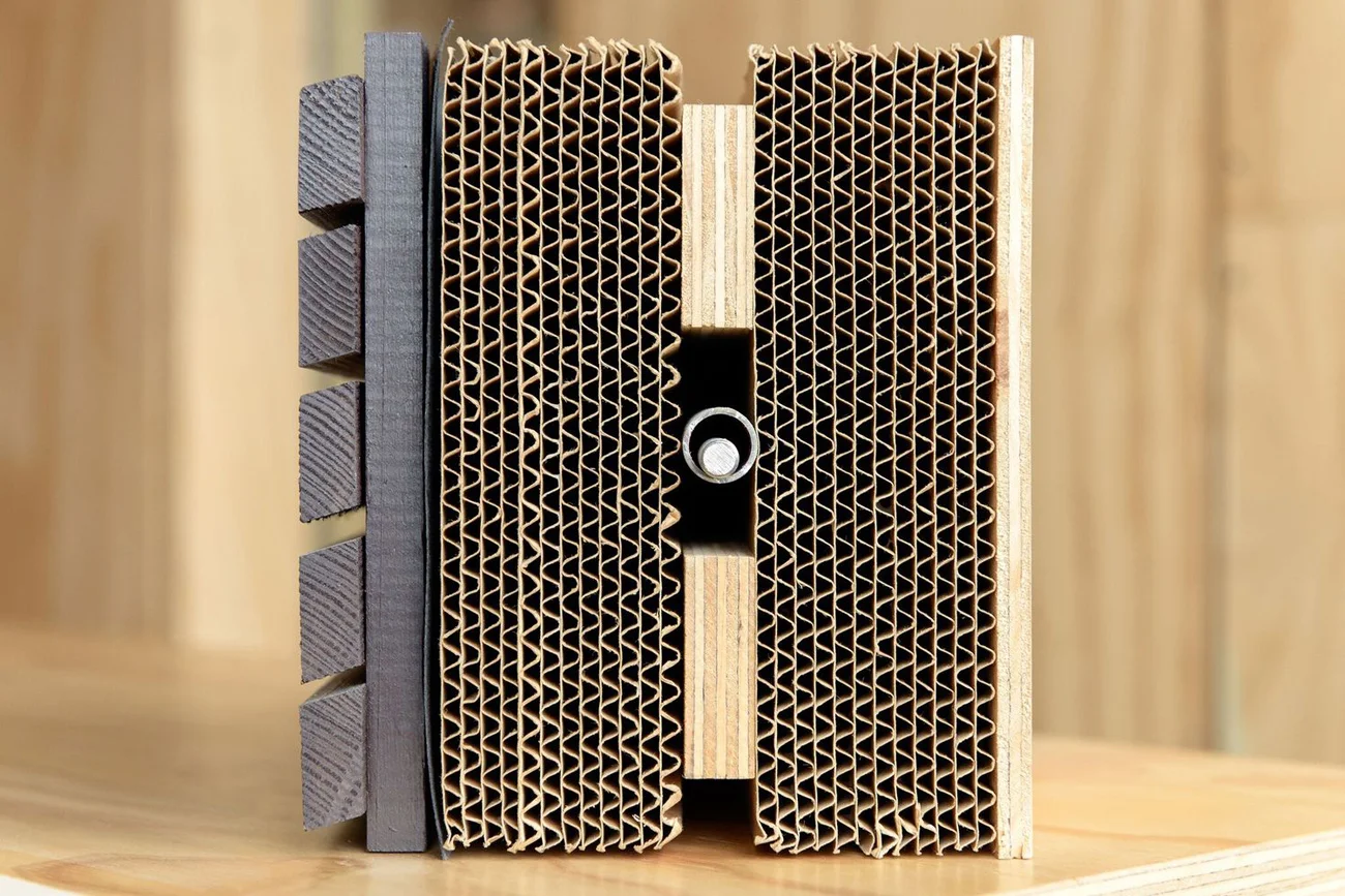 Основу дома составляют модульные конструкции, изготавливающиеся на производстве путем наматывания на каркас 24 слоев картонного полотна. Слои скрепляются между собой высокопрочным экологичным клеем. Каждый сегмент имеет размеры 4,5х3,5х1,2 м и весит около 500 кг.