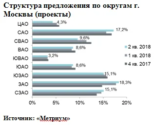 Выход новых проектов и очередей внес коррективы в структуру предложения. По итогам полугодия лидирующую позицию по объему квартир занял САО (20,6%), однако его доля снизилась на 2,8 п.п. за счет вымывания предложения. На втором и третьем местах – ЗАО (18,8%) и СЗАО (18,0%). Лидерами роста за анализируемый период выступили ЗАО (+3,1 п.п. к 4 кв. 2017), ЮАО (+1,9 п.п.) и СЗАО (+1,6 п.п.).