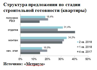 Более половины экспонируемых квартир представлено в корпусах на этапе монтажа и в зданиях, находящихся на стадии проведения отделочных работ – 34,2% (+3,2 п.п. к 4 кв. 2017) и 31,4% (-9 п.п.) соответственно. Заметно выросла доля лотов в домах, уже получивших разрешение на ввод в эксплуатацию (+4,2 п.п.) – до 18,4%. Наименьший объем квартир реализуется в новостройках на начальном этапе строительства – 16,0% (+1,5 п.п.).