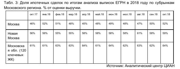 В октябре зафиксирован рекордный объём ипотечных сделок, при этом их доля в общем объёме по-прежнему стабильна. По итогам октября на рынке новостроек Московского региона было заключено рекордное количество ипотечных сделок за 2018 год – 8100 (+28% по сравнению с прошлым месяцем), тогда как в январе – сентябре среднемесячный уровень продаж с использованием жилищного кредитования составлял 6000 сделок. Рост наблюдается во всех локациях: +31% в старых границах Москвы, +17% в Новой Москве и +30% в новостройках Подмосковья. Доля сделок с привлечением банковского финансирования стабильна, за рассматриваемый период меняется незначительно. Она колеблется на 1-2 пп. относительно средних значений, которые составляют 52% в Москве в старых границах, 59% в Новой Москве, 64% в Московской области (см. табл. 3).