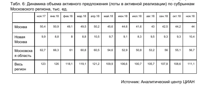 Общий объем предложения жилья в Московском регионе растёт четвертый месяц подряд. С августа 2018 года объём предложения на рынке новостроек Московского региона стабильно растет (в среднем на 2% в месяц). В активной реализации по итогам октября находится 111,1 тыс. квартир и апартаментов (+2,3% за месяц) (см. табл. 6). Год назад аналогичный показатель составлял 123 тыс. лотов (снижение произошло за счет вывода с рынка замороженных проектов). Наиболее существенный рост наблюдается на рынке Новой Москвы – +11,8% (до 10,4 тыс. лотов), за счёт увеличения объёма предложения более чем на 40% в ЖК «Акватория», «Москвичка», «Акватория», Новая Звезда» и «Акватория», Южное Бунино». Количество лотов в активной реализации на рынке «Акватория», старой» Москвы изменилось несущественно – -0,5% (до 44 тыс. единиц) по сравнению с прошлым месяцем. Увеличение активного предложения на 2,9% отмечено в Московской области.