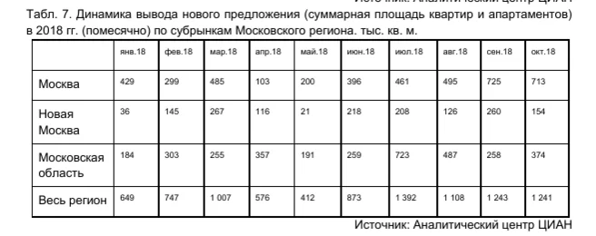 Рынок растет, прежде всего, за счет новинок рынка. По всем трём локациям по итогам октября 2018 года наблюдается рост доли продаж в корпусах на этапе котлована: +10 пп. в старых границах Москвы, +7 пп. в Новой Москве и +9 пп. в Московской области по сравнению с сентябрём 2018 года. При этом более чем на 5 пп. снизились доли продаж в домах на высокой стадии строительства (монтаж верхних этажей, отделка).