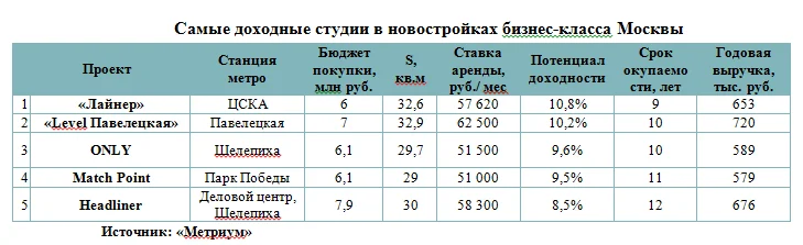 Самая доходная студия в новостройке бизнес-класса Москвы принесет владельцу 10,8% годовых, а сумма первоначальных вложений составит немногим более 6 млн рублей, подсчитали эксперты компании «Метриум». В денежном выражении ежегодный доход от такого бизнеса принесет инвестору более 650 тыс. рублей в год.