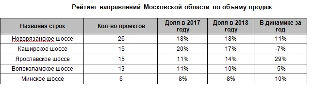 Лидирующим направлением Подмосковья стало Новорязанское шоссе с долей 18%. Второе и третье места занимают Каширское и Ярославское направления - 17% и 14% соответственно.