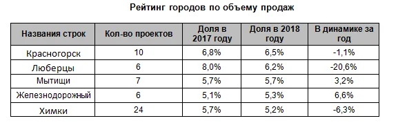 В пяти городах было реализовано 28,9% от общего объема продаж в Подмосковье. Среди них лидером по количеству зарегистрированных ДДУ стал город Красногорск с долей 6,5%, второе место занимают Мытищи, третье – Люберцы.