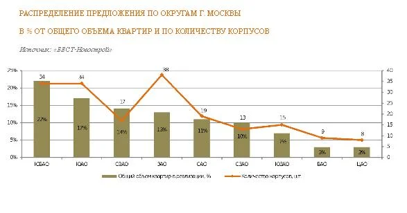 В лидеры по объему предложения доступных новостроек вышел Юго-Восточный округ, где сконцентрировано 22% от общего объема квартир в продаже. На втором месте – ЮАО (17%), на третьем – СВАО, где доля предложения за год увеличилась вдвое, до 14% от общего объема квартир на экспозиции.