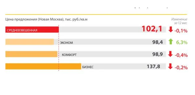 В ноябре 2016 года средневзвешенная цена предложения на рынке Новой Москвы составила 102,1 тыс. руб. за кв. м (1585 долл. за кв. м), что на 2,5% меньше по сравнению с аналогичным периодом прошлого года. Средний бюджет покупки за 12 месяцев снизился на 8,9% и составил 5,6 млн руб.