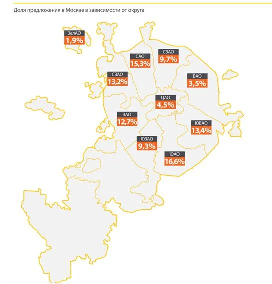 По округам наибольший объем предложения сконцентрирован в ЮАО (16,6%). Лидером по росту предложения за год оказался ЮВАО – предложение увеличилось на 193,2%. Наименьший выбор квартир представлен в ЗелАО (1,9%).