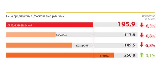 Средневзвешенная цена предложения в Москве составила 195,9 тыс. руб. за кв. м (3043 долл. за кв. м), за 12 месяцев данный показатель снизился на 6,3%. Прежде всего, это связано с выходом новых проектов на низкой стадии строительной готовности.