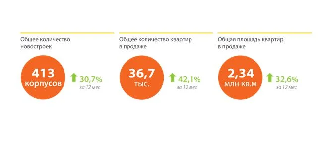 По сравнению с предыдущим годом общее количество новостроек в Москве выросло на 30,7% и составило 413 корпусов в 170 проектах (без элитного сегмента). При этом количество квартир в реализации выросло на 42,1%. За прошедшие 12 месяцев наибольший уровень объёма предложения был зафиксирован в октябре 2016 – 2,36 млн кв. м.