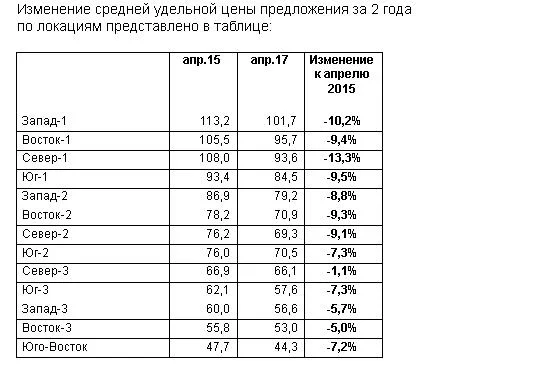 По итогам апреля значимое уменьшение средней удельной цены предложения отмечено на западном направлении ближнего пояса – на 1% (преимущественно за счет уменьшения цены предложения в Красногорске), в ближнем поясе северного направления (-0,9%) и в среднем поясе восточного направления (-0,7%). В остальных локациях наблюдалось уменьшение цены предложения в пределах погрешности.