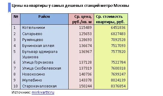 Рядом с какими станциями метрополитена можно купить самые дешевые квартиры в Москве? Специалисты портала «Мир квартир», проанализировав цены на московскую недвижимость, составили соответствующий рейтинг. Все станции, попавшие в Топ-10, находятся за внешней границей МКАД, а лидер рейтинга, «Котельники», – на территории Московской области.