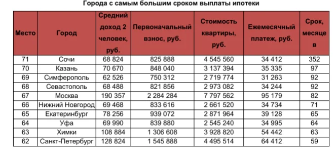 При заданных условиях максимальный срок ипотеки оказался в Сочи. На то, чтобы закрыть кредит на курорте, имея средний по Краснодарскому краю доход, потребуется 29 лет и 4 месяца. При стоимости квартиры 4 545 560 рублей переплата составит 8 398 498 рублей. На втором месте - Казань. В столице Татарстана на ипотеку уйдет 8 лет и 1 месяц при 1 123 231 рублей переплаты. В тройке аутсайдеров и крымские города Симферополь и Севастополь. На то, чтобы закрыть здесь кредит, нужно 7 лет и 8 месяцев. При этом разница между рыночной ценой квартиры и стоимостью жилья в ипотеку составит 920 566 рублей. На пятом месте – Москва (6 лет и 10 месяцев). Замыкает десятку Санкт-Петербург (почти 5 лет).