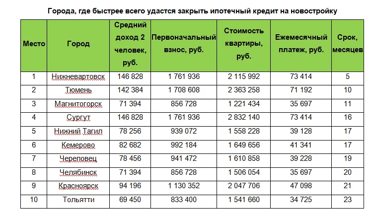 Быстрее всего ипотеку за 38 кв. метров в новостройке выплатят жители Нижневартовска. Кредит за квартиру такой площади здесь можно погасить за пять месяцев. На втором месте рейтинга Тюмень. Здесь полностью расплатиться за ипотеку в новом доме удастся за 10 месяцев. Третье место у Магнитогорска (Челябинская область): срок выплаты не превышает 11 месяцев. Сам Челябинск также вошел в десятку городов с минимальным сроком ипотеки: погасить кредит здесь удастся за год и восемь месяцев. Замыкает топ-10 городов Тольятти. Здесь закрыть вопрос с выплатой ипотеки получится чуть меньше чем за 2 года.