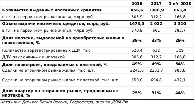 По данным Банка России, за первое полугодие 2018 года выдано 663,4 тыс. ипотечных кредитов на общую сумму 1310 млрд руб. (+57% в количественном и +69% в денежном выражении к соответствующему периоду 2017 года). На приобретение жилья на первичном рынке предоставлено 166,8 тыс. кредитов на сумму 382,7 млрд рублей (+ 45% по сравнению с прошлым годом). При этом объем кредитования жилья на вторичном рынке вырос еще сильнее, на 82%: выдано кредитов на сумму 926,7 млрд рублей.