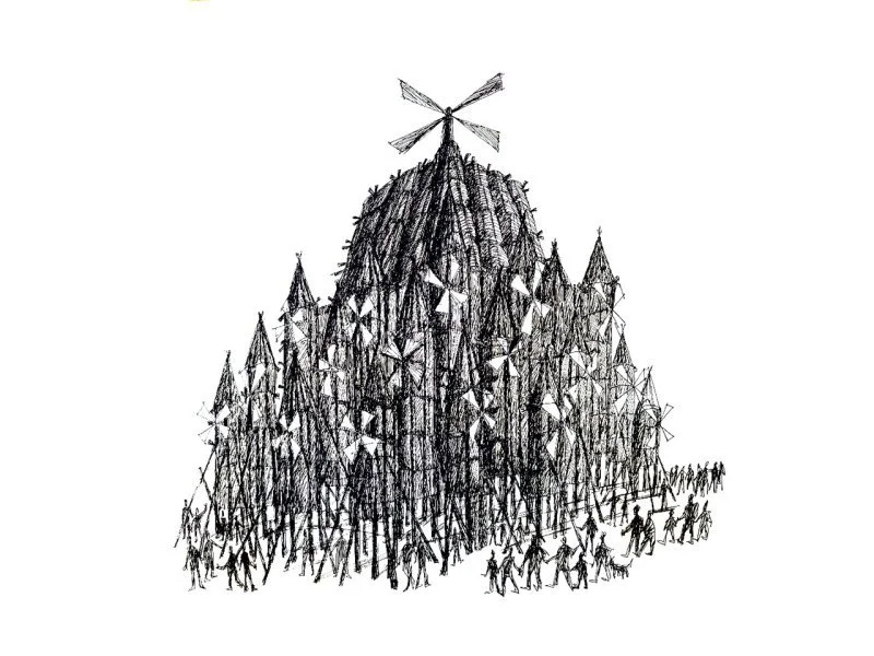 Автором объекта 2025 года стал основатель арт-парка Николай Полисский. «Мельницы» – это комплексное сооружение из 24 башен, центральная из которых достигает высоты 26 метров. В качестве материала использовали отработанное дерево – горбыль, паллеты, тонкомер – и сено.