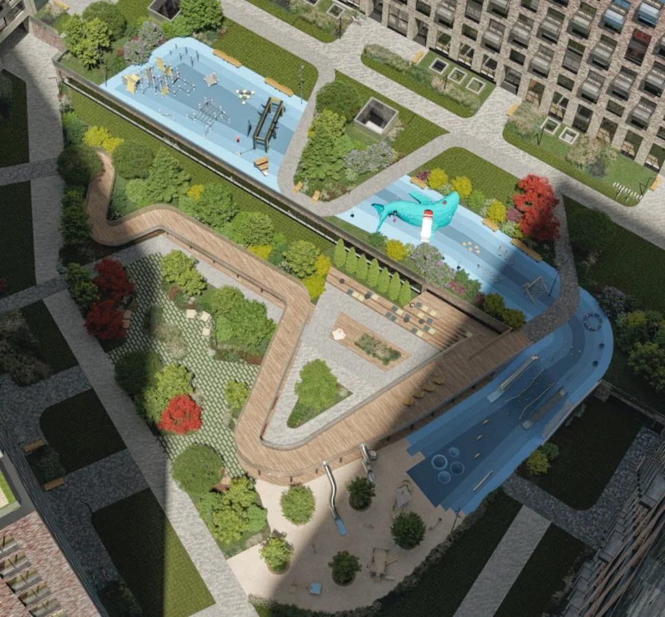 Жилой комплекс реализуется по адресу: Причальный проезд, вл. 8. В доме разместится полноформатный гибкий офис площадью около 500 кв. метров. Дворовая зона open space будет являться его концептуальным продолжением. Дизайн пространства разработан бюро Upland.