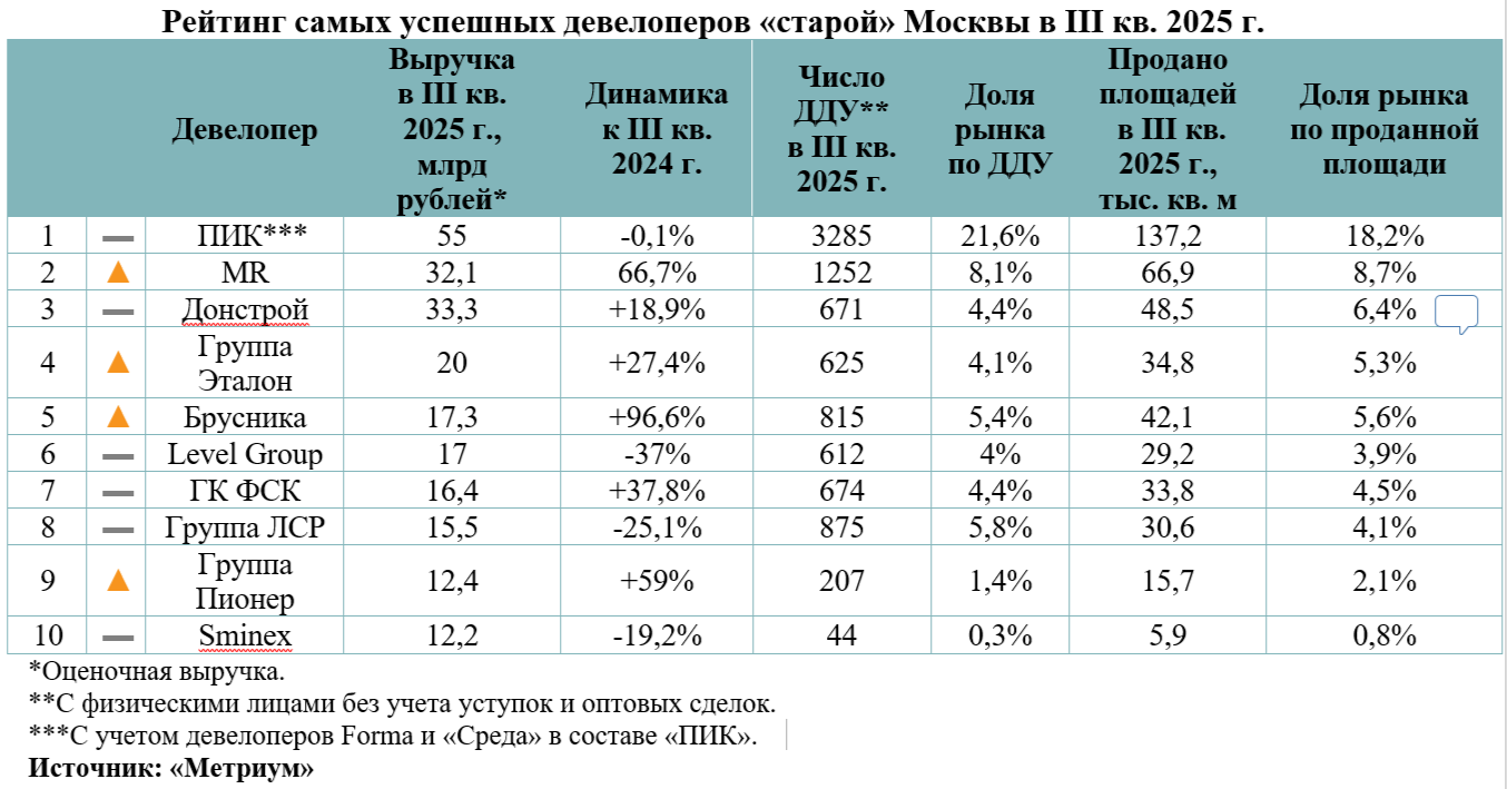 Общая выручка 10 самых успешных девелоперов «старой» Москвы по итогам III квартала 2025 года достигла 235,1 млрд рублей, а всех застройщиков в исторических границах столицы – 404 млрд рублей, подсчитали аналитики компании «Метриум». Относительно III квартала 2024 года эти показатели выросли на 11,1% и 17,1% соответственно.