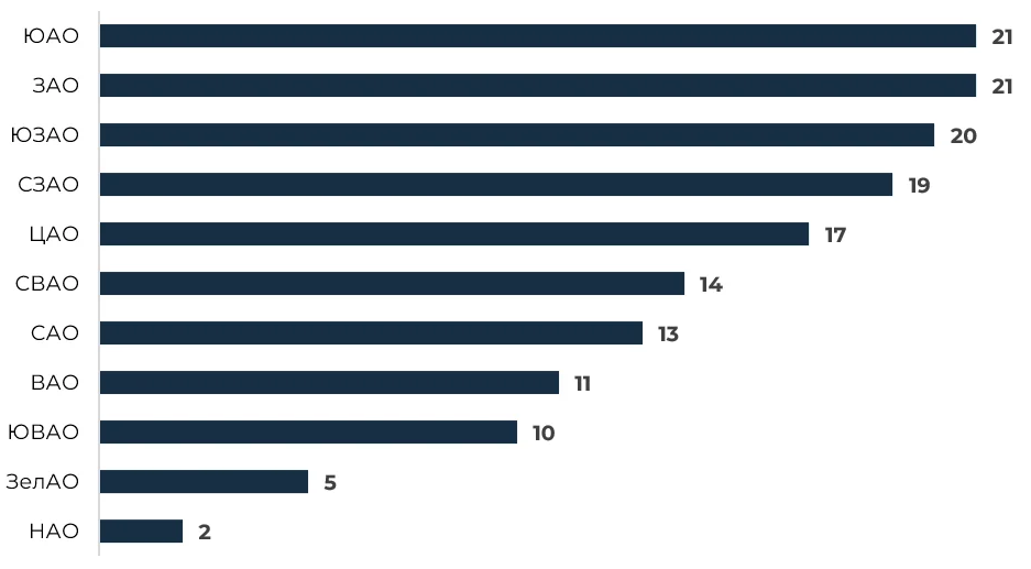 Лидерами по количеству устаревших торговых центров стали ЮАО и ЗАО – по 21 объекту в каждом округе. Далее следуют ЮЗАО с 20 объектами и СЗАО с 19. Наименьшая потребность в реновации зафиксирована в НАО, где таких объектов всего два, и в ЗелАО – пять, что во многом связано с более поздними сроками их застройки.