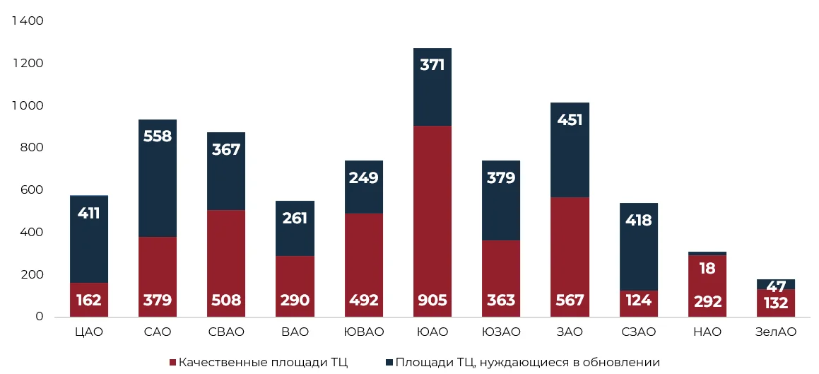 В марте 2026 года 51% торговых центров Москвы нуждается в реновации, так как две трети столичных ТЦ были построены более 10 лет назад, а в ряде округов столицы доля устаревших площадей достигает 70%. Такие данные «Стройгазете» сообщили консалтинговой компании NF GROUP.