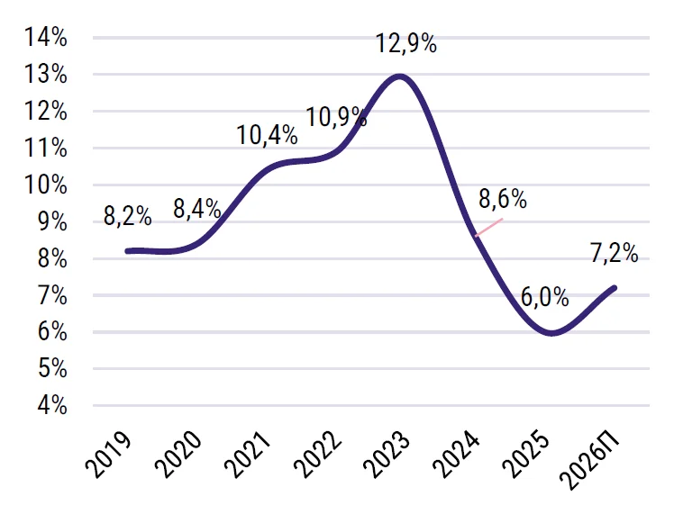 Доля свободных помещений в форматных ТЦ Москвы, 2019-2026П