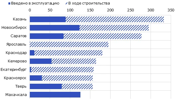 ТОП-10 городов в регионах по заявленному объему годового ввода (без учета рынка СПБ и ЛО), тыс. кв. метров