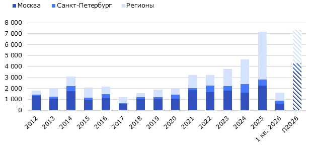 По итогу I квартала на складской рынок недвижимости Москвы и области пришлось 38% (621 тыс. кв. метров) нового предложения. Однако к концу 2026 года в столице и области ожидается рекордное значение годового ввода — 3,6 млн кв. метров.