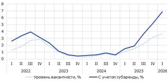 Динамика уровня вакантных готовых площадей с и без учета предложения в субаренду