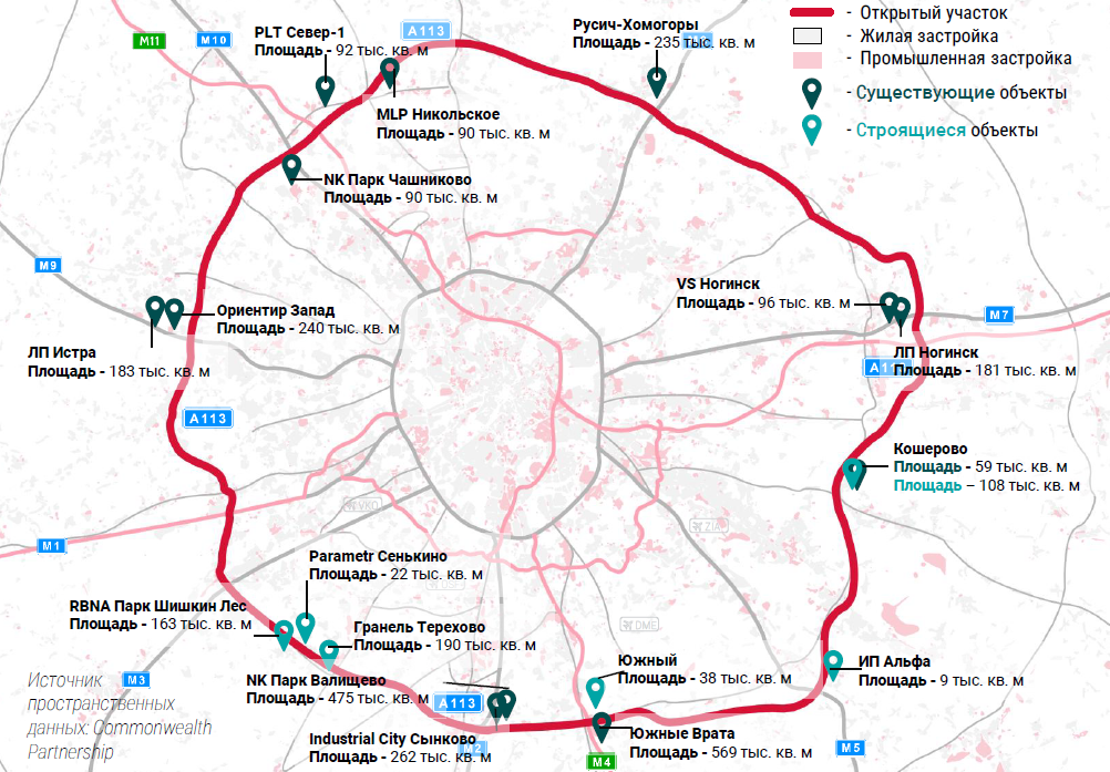 Площадь строящихся складских объектов классов А & B вдоль Центральной кольцевой автомобильной дороги (ЦКАД) Московской области с заявленной датой ввода в эксплуатацию до 2027 года составит 586 тыс. кв. метров. Такие данные «Стройгазете» предоставили в компании Commonwealth Partnership (CMWP).