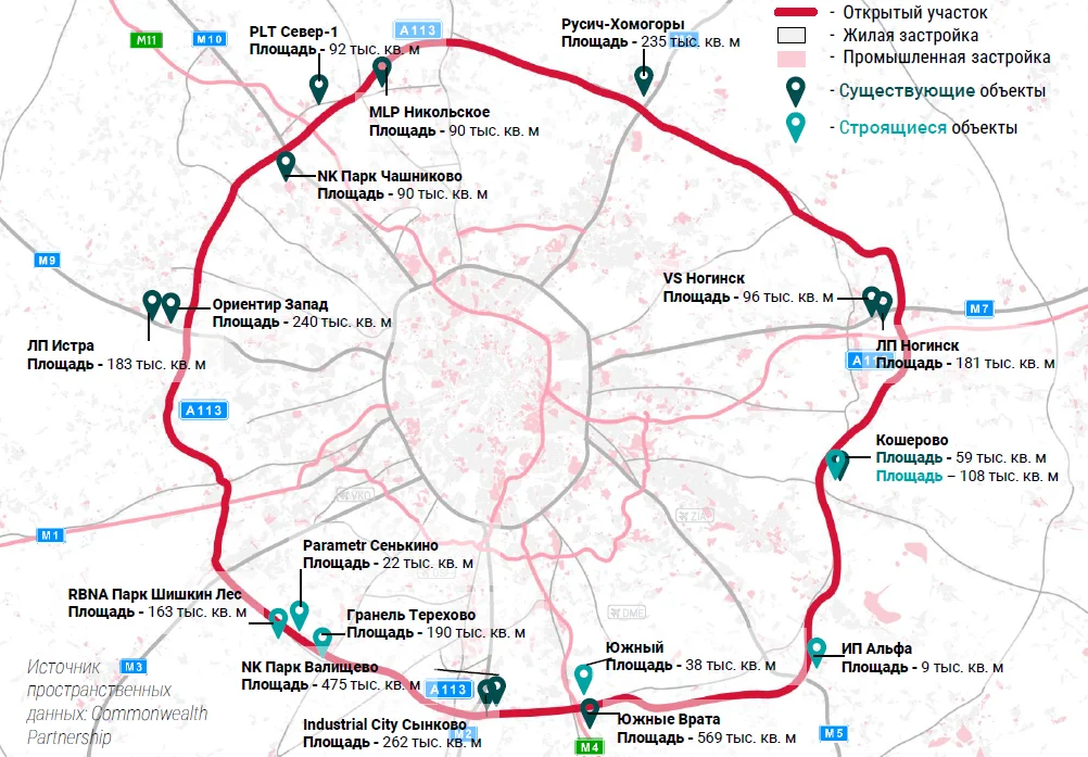 Площадь строящихся складских объектов классов А & B вдоль Центральной кольцевой автомобильной дороги (ЦКАД) Московской области с заявленной датой ввода в эксплуатацию до 2027 года составит 586 тыс. кв. метров. Такие данные «Стройгазете» предоставили в компании Commonwealth Partnership (CMWP).