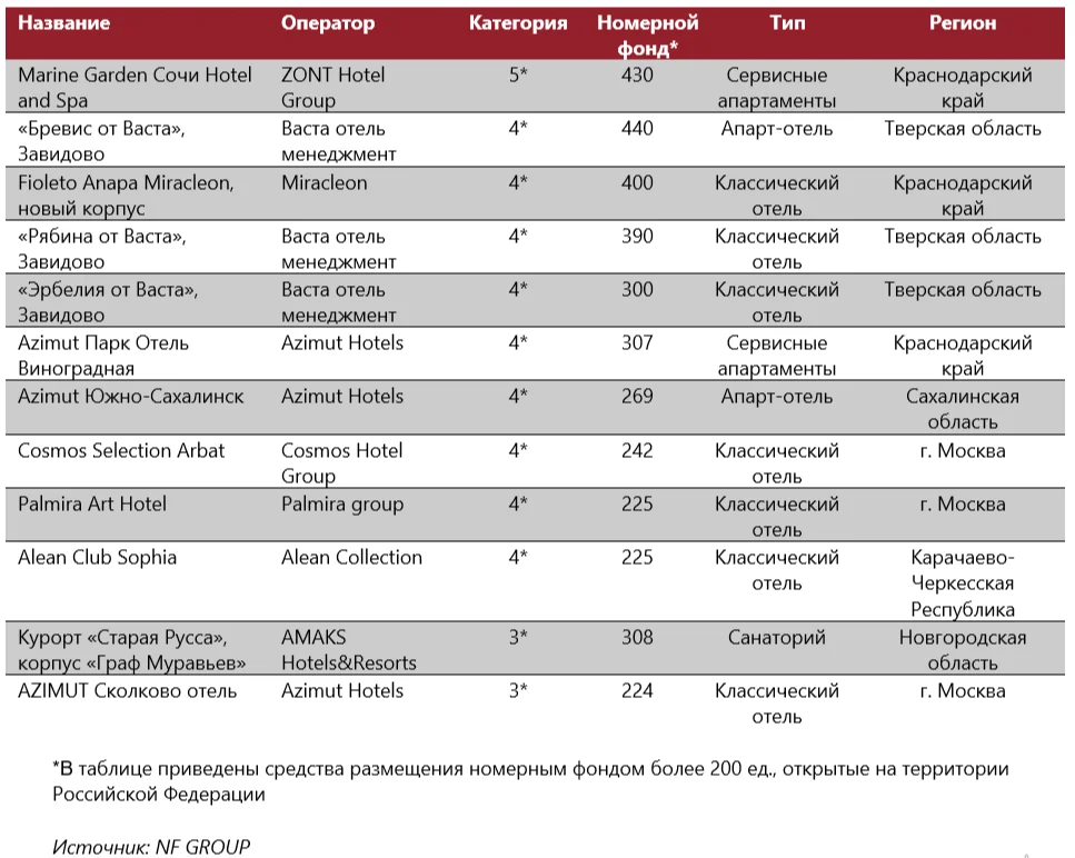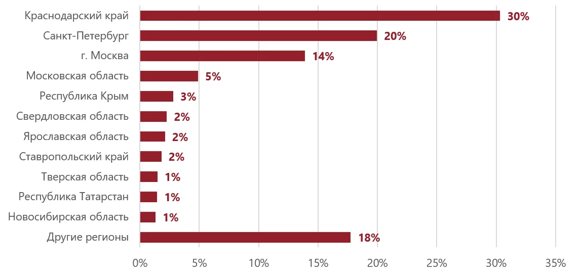 Регионами с наибольшим объемом номерного фонда под управлением российских операторов являются Краснодарский край, Санкт-Петербург и Москва. Совокупно на эти регионы приходится почти 50 тыс. номеров, что составляет около двух третей общего числа качественных средств размещения в стране.
