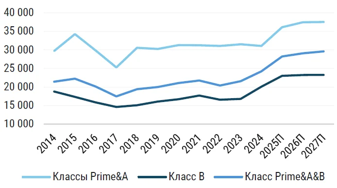 «Динамика индикатора средневзвешенной базовой арендной ставки в ключевых деловых районах более выраженная – в отдельных случаях рост приближается к 50%, а верхняя граница диапазона ставок находится около 100 тыс. рублей за кв. метр в год. Средневзвешенная базовая ставка аренды в классе Prime составила 51 936 руб. за кв. метр в год, в классе А – 33 592 рублей; в классе В – 23 553 рублей», – отметила старший директор, руководитель департамента исследований и аналитики CMWP Полина Афанасьева.