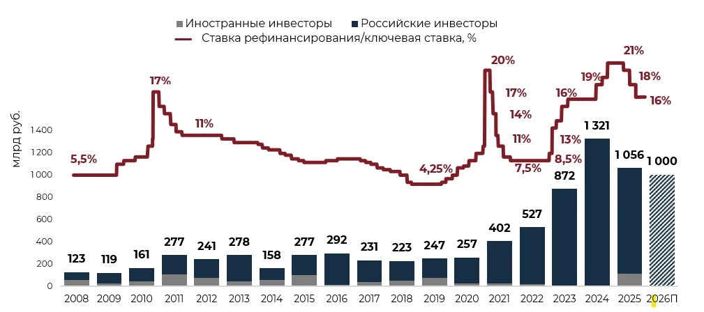 По оценке NF GROUP, в 2026 году инвестиционный рынок коммерческой недвижимости будет развиваться в логике консолидации и отбора качественных активов, объем инвестиций сохранится на уровне около 1 трлн рублей, что сопоставимо с итогами 2025 года.