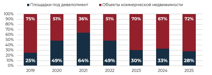 Наиболее заметную динамику в 2025 году показала торговая недвижимость. Объем вложений достиг 173,6 млрд руб., увеличившись на 153% год к году. Причиной такого роста на фоне 2024 года стала крупнейшая сделка года – приобретение доли в Malltech Holding компанией из Balchug Capital (Армения).