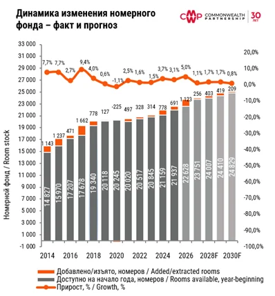 Партнер, департамент гостиничного бизнеса и туризма CMWP Марина Усенко отметила, что с учетом 1 123 номеров в 6 объектах различных ценовых категорий, 2026 год может стать довольно «продуктивным» для московского гостиничного рынка, однако 5% прирост предложения не сможет переломить нисходящую тенденцию, причины которой вполне фундаментальны: дефицит пригодных для строительства отелей участков, конкуренция за участки с проектами иного назначения, отсутствие доступного проектного финансирования, ограниченный выбор профессиональных (сетевых) операторов, сокращение рентабельности действующих отелей.