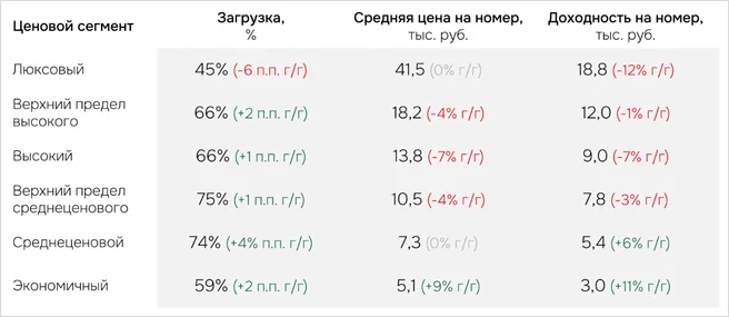 За первые два месяца 2026 года тарифы на проживание были скорректированы практически во всех ценовых сегментах. Так, согласно данным экспертов, по сравнению с аналогичным периодом предыдущего года наибольшее снижение средней цены на номер зафиксировано в высоком ценовом сегменте – на 7% (13,8 тыс. рублей). В верхнем пределе высокого и верхнем пределе среднеценового сегментов снижение составило 4% (18,2 тыс. рублей и 10,5 тыс. рублей соответственно). Данная динамика отразилась и на доходности на номер: наибольшее снижение индикатора зафиксировано в люксовом сегменте – на 12% (18,8 тыс. рублей), а также в высоком ценовом сегменте – на 7% (9,0 тыс. рублей).