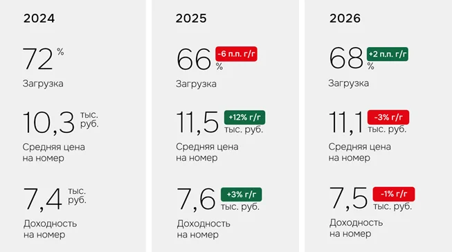Генеральный директор IBC Real Estate Алексей Ефимов отметил, что в начале 2026 года наблюдалось на гостиничном рынке столицы новую тенденцию: отельеры снизили тарифы на проживание в период продолжительных праздничных дней, что позволило стимулировать спрос и увеличить уровень загрузки. Однако снижение темпов роста экономики, охлаждение потребительской активности, а также усиление конкуренции со стороны альтернативных форматов размещения препятствуют дальнейшему росту доходности отелей.