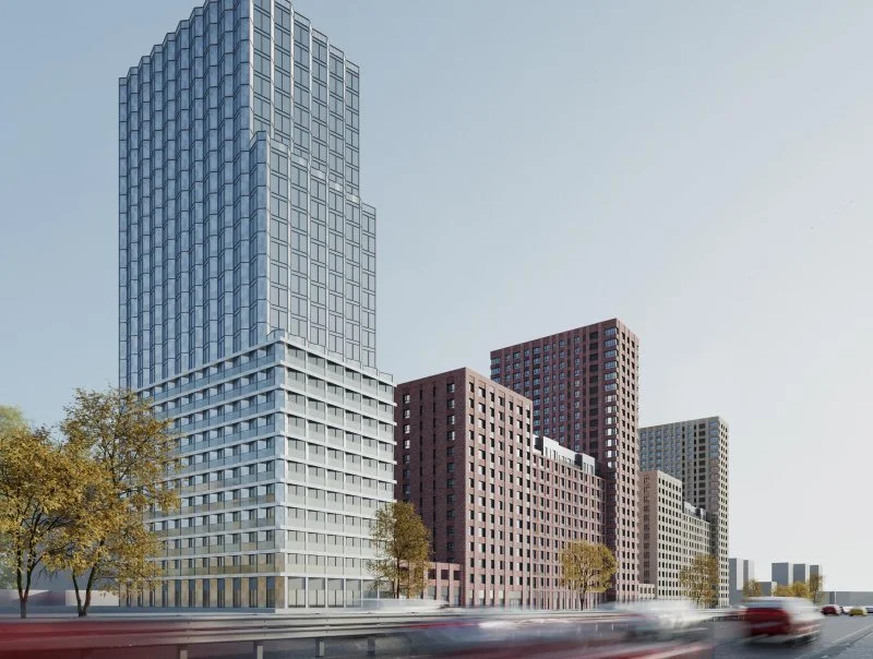Башню-доминанту девелопер выполнит из стекла и серебристых металлических панелей, подчеркивающих сложную геометрию фасадов. Более низкая центральная часть проекта будет оформлена бетонной плиткой «под кирпич» в природных оттенках: терракотовом и песчаном. Дополнят отделку контрастные вставки из темного металла, которые подчеркнут строгие, регулярные фасады.