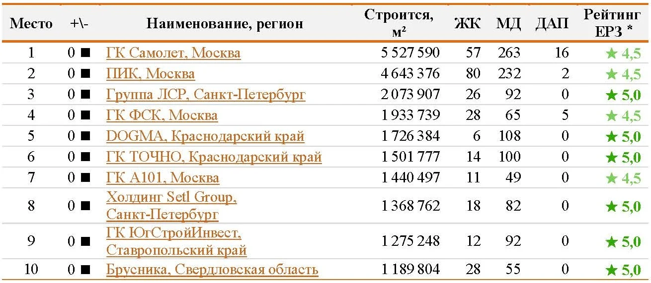 Замыкает тройку лидеров, как и в предыдущем ранжировании, Группа ЛСР, которая сохранила объем текущего жилищного строительства 2,074 млн кв. метров. Рейтинг застройщика по-прежнему составляет ★ 5,0.