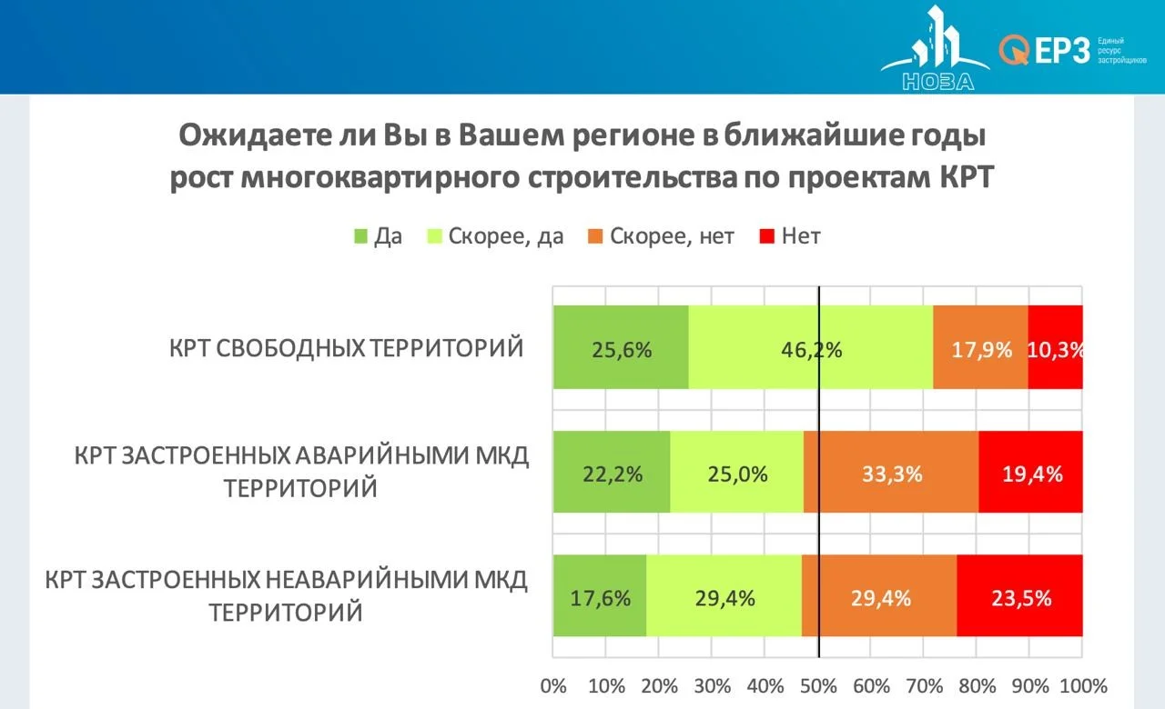 По его словам, в части проектов КРТ застроенных территорий аварийными домами оптимизма меньше – здесь роста ожидают только 47% респондентов. Примерно столько же респондентов прогнозируют рост проектов КРТ застроенных неаварийными МКД территорий.