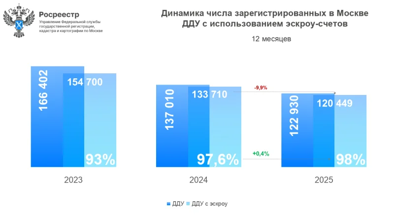 За 12 месяцев 2025 года Росреестром по Москве зарегистрировано 120 449 договоров участия в долевом строительстве в отношении жилой и нежилой недвижимости с использованием эскроу-счетов. Доля ДДУ, оформленных с применением проектного финансирования, при этом достигла 98%. Об этом рассказала заместитель руководителя Управления Росреестра по Москве Мария Макарова.