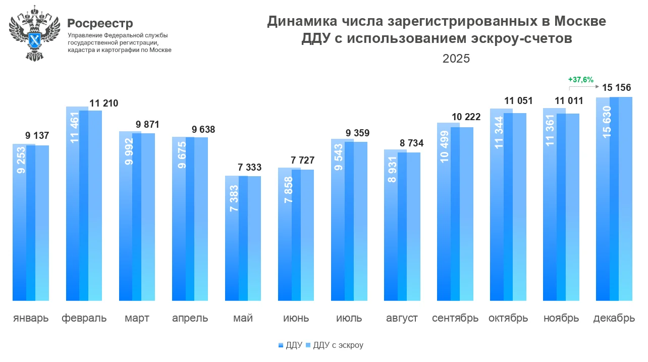 В декабре 2025 года Управлением Росреестра по Москве зарегистрировано 15 156 договоров участия в долевом строительстве в отношении жилой и нежилой недвижимости с использованием эскроу-счетов. Данный показатель на 37,6% больше результата ноября (11 011 ДДУ). По отношению к аналогичному месяцу 2024 года (15 185 ДДУ) число сделок с эскроу сопоставимо с разницей в -0,2% или 29 сделок.