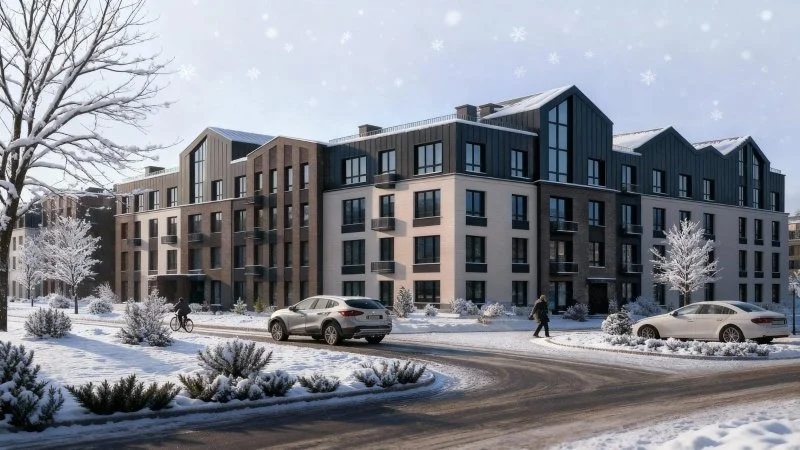 Архитектура комплекса выполнена в современном урбанистическом стиле с элементами скандинавской лаконичности. Открытые пространства между корпусами с зелеными насаждениями, дорожками и парковочными зонами формируют комфортную и безопасную среду для жизни.